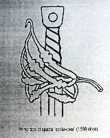 Gli esemplari più vecchi montano il pomo di ferro di stile quadrotto, caratteristico delle spade schiavonesche, mentre dal terzo tipo in poi è più comune il pomo in ottone detto a “testa di gatto”. Questa spada comparve verso la metà del Cinquecento al fianco delle milizie levantine degli “Oltremarini”, come si chiamavano i veneziani, tra le quali si distinguevano gli Schiavoni (da cui il nome della spada), assoldati anche nella Guardia del corpo dei Dogi. All’inizio, per evitare l’impiego della manopola, la spada era dotata di un semplice fornimento composto da due o tre rami trasversali di protezione, la meravigliosa gabbia che nei secoli successivi si svilupperà in varie tipologie, la si deve infatti al grande maestro Andrea Ferara. Fu una spada prettamente da munizione, si conoscono pochi esemplari firmati, fatti costruire su commissione. Per questo motivo è un’arma che figura poco nell’iconografia. Come si sa, i pittori affermati preferivano ritrarre i grandi personaggi del momento, previo lauto compenso. Oltretutto, le rare volte che veniva presa in esame, figura sempre il primo tipo di spada, perché era il più appariscente. E si vedono i rami della guardia, l’impugnatura e il pomo che spesso è dipinto di giallo, cosa che con il quarto e quinto tipo di Schiavona non figurerebbero così bene. La gran massa delle lame reca i marchi delle varie botteghe dell’Ardo. Dai ferri di molino alle croissant dentellate (da non confondere con quelle stiriane) e alle due mezze lune dal volto umano addossate. Il leone in moleca, impresso sui rami delle gabbie in prevalenza del secondo tipo, non c’entra, è solo il vecchio simbolo di proprietà dell’Armeria del Consiglio dei Dieci. E’ interessante notare che questo ultimo marchio, le due mezze lune, fu largamente imitato su lame di spade sudanesi dai tempi di Mahdi, le Kaskara. Alcune di queste spade islamiche, caratteristiche per l’elsa a croce e il pomo a ruota, montano lame di antiche Schiavonesche probabilmente rimaste in terra d’Africa in seguito a fatti d’arme o arrivate per vie commerciali non del tutto legali trattandosi di acquirenti, come ben noto, ostili alla Repubblica di Venezia. La bontà di queste vecchie lame, tuttavia, è stata talmente apprezzata, tanto da imitarne grossolanamente i marchi nei secoli successivi, sulle povere spade locali.