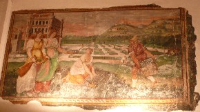 Tornando agli affreschi, interessante è la raffigurazione dell’inverno, ove si descrive nei particolari una giornata di festa dei padroni di casa, con in tavola i prodotti locali (si riconosce un pollo, ruspante sicuramente), una coppa di vino ed altre delizie, la cacciagione di piuma appesa alle pareti.
