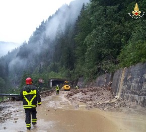 Laltro intervento di rilievo si è svolto a San Pietro di Cadore, loc. Mare, dove si è verificato uno smottamento su un pendio particolarmente ripido. La colata di fango ha interessato alcune abitazioni, la strada comunale e la statale. L’edificio a valle, sulla direttrice della colata, la notte scorsa è stato evacuato.