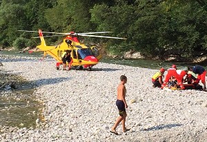 Longarone (BL), 21-07-15 Sono gravi per un uomo le conseguenze di un tuffo nel Piave. Attorno alle 17, una squadra del Soccorso alpino di Longarone, allertata dal 118, è subito intervenuta assieme al personale dell’ambulanza nella zona conosciuta con nome di ‘Elech’, a Codissago, dove D.S., 39 anni, di Longarone (BL), si era tuffato da una decina di metri in una pozza d’acqua del fiume Piave, cadendo male sui sassi.