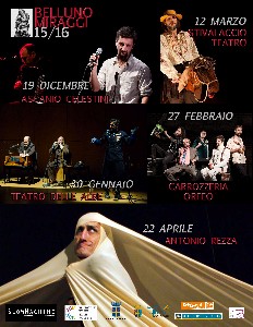La stagione che sta per arrivare è una ventata di aria nuova che spazia tra proposte di teatro di narrazione, teatro civile, teatro sperimentale, teatro di ricerca, teatro classico in versione di tragicommedia, teatro performativo comico, drammaturgia contemporanea ecc… Una proposta culturale di 5 spettacoli che tocca i temi del contemporaneo che, come la precedente edizione, punta sulla qualità e si vuole distinguere nella necessità di parlare direttamente allo spettatore, confrontandosi con l’evoluzione delle diverse forme teatrali. Una proposta ricca e complessa, che dà spazio a diversi tipi di pubblico e che porterà a Belluno lavori di artisti e compagnie di altissimo livello e due prime regionali che potranno dar luce alla città a livello regionale e anche nazionale. Questo progetto è realizzato grazie al contributo della Fondazione Teatri delle Dolomiti e al Patrocinio del Comune di Belluno.