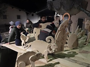 I bambini e l’artista hanno lavorato per una settimana per costruire le statue, montarle e collocarle nella fontana (il Comune ha autorizzato a utilizzarla). “Il presepe nasce dall’intento di unire la popolazione, e i bambini in particolare, per rafforzare la loro identità e il loro legame con il territorio” spiega Mauro Lampo. Hanno tagliato il legno, lo hanno levigato e hanno assemblato i vari pezzi, realizzando tutte le statue e montandole all’interno della fontana. Il laboratorio è durato una settimana. Ogni sera i piccoli artisti, sotto la guida di Lampo, si sono messi all’opera e giovedì sera hanno terminato l’installazione delle figure.