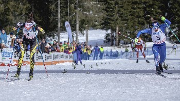 La gara maschile – La gara maschile ha visto subito formarsi al comando un tandem composto da Giandomenico Salvadori (Fiamme Gialle), vincitore della 15 km in classico, e Dietmar Noeckler (Fiamme Oro), bravo a colmare il gap di una decina di secondi accumulato nella 15. I due vanno di comune accordo e sono vani i tentativi di ricongiungimento operati da un altro tandem, quello formato da Sebastiano Pellegrin (Fiamme Oro) e Giorgio Di Centa (Carabinieri). L’epilogo è affidato alla volata, volata che vede lo spunto vincente di Noeckler su Salvadori. Volata anche per il bronzo, con Pellegrin che batte Di Centa.