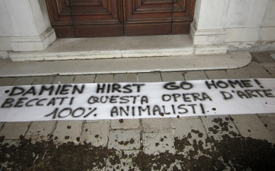 Per mostrare tutto il nostro disprezzo verso questo falso artista e chi lo sostiene – conclude la nota – nella notte tra il 6 e 7 marzo, i nostri militanti hanno posizionato davanti all’entrata di Palazzo Grassi a Venezia (raggiunto in barca), uno striscione ironico contro Damien Hirst e scaricato oltre 50 kg di sterco animale. Non sono escluse altre azioni e blitz a sorpresa contro la vergognosa ‘mostra’ prima e durante”.
