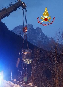 L’autovettura, uscita di strada autonomamente presumibilmente per il fondo stradale ghiacciato, è finita capottata ad una decina di metri dalla sede stradale. Uno dei due occupanti è riuscito a chiedere soccorso, mentre l’altro è rimasto incastrato e si è reso necessario l’uso di attrezzature per il taglio e divaricazione delle lamiere.