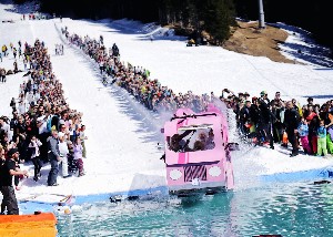 Alleghe, 31 marzo 2019 –  L’evento più atteso della stagione non ha tradito le aspettative, con migliaia di giovani che si sono divertiti a costruire mezzi originali mostrando grande spirito di iniziativa, originalità e condivisione. Come ogni anno, lo Splash Party si rivela essere un must del divertimento sulle Dolomiti. L’obbiettivo della giornata era quello di arrivare a tuffarsi nella famigerata piscina possibilmente cercando di attraversare con il proprio mezzo l’intero specchio d’acqua di 30 metri, al termine di una adrenalinica discesa. Alla gara si sono presentati 8 mezzi costruiti utilizzando ogni materiale: dal legno agli sci, passando per le lamiere. Una settantina invece chi ha tentato l’impresa con sci e snowboard. A decidere il destino dei partecipanti una giuria mista composta anche dai maestri di sci del comprensorio Alleghe Civetta.