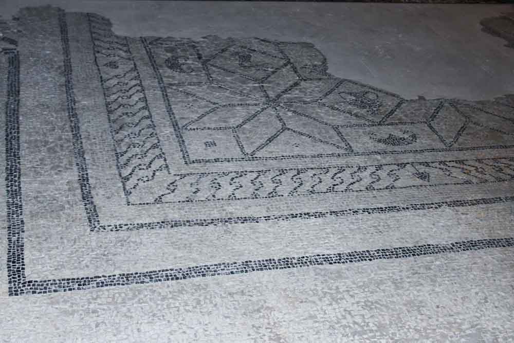 Il mosaico, che risale al II secolo, fa parte della pavimentazione originale di un’abitazione romana di età imperiale rinvenuta nel 1951 di fronte al Municipio di Pieve di Cadore: si tratta del pavimento musivo più complesso rinvenuto nella domus, realizzato in tessere bianche e nere con rare inserzioni di tessere rosse e decorato con le raffigurazioni di un pelte (scudo), un delfino e un kantharos (coppa) inseriti in cornici geometriche in tessere nere.