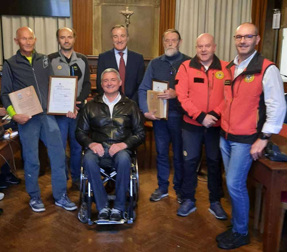 Alla presenza del sindaco di Belluno, Oscar De Pellegrin, del consigliere nazionale del Cnsas Fabio Rufus Bristot, del Delegato Alex Barattin e del capo della Stazione di Belluno Gianpaolo Sani, ai due storici soccorritori sono stati consegnati gli attestati di stima e profondo ringraziamento, di fronte ai numerosi volontari, alle famiglie e ai rappresentanti dell’amministrazione comunale.