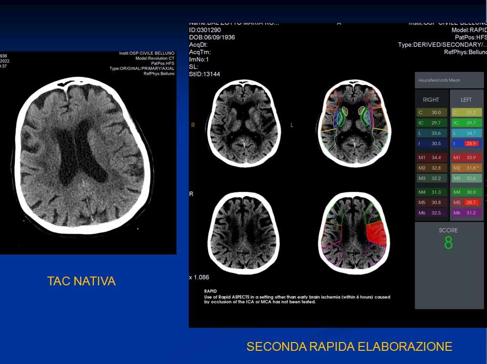 Tutte le TAC presenti negli ospedali della provincia di Belluno (Belluno, Feltre, Agordo e Pieve di Cadore) sono state dotate di nodi di trasmissione dati verso il software RAPID, il quale elabora rapidamente le immagini delle tac cerebrali eseguite per il sospetto di stroke e invia i risultati in un sistema, nel quale è presente anche un APP, a cui possono accedere tutti i professionisti abilitati. In particolare i neurologi e radiologi dei diversi ospedali e i neuroradiologi di Treviso attualmente nostro centro HUB per la rimozione dei coaguli nei vasi cerebrali (trombectomia).