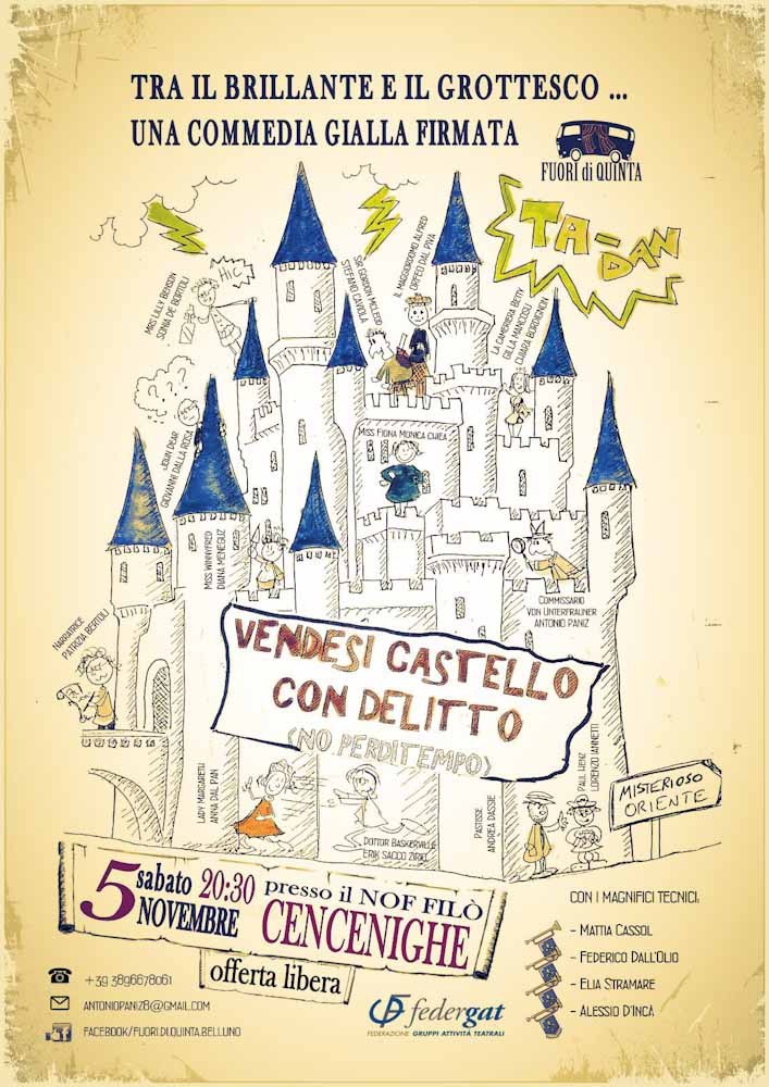 Sabato 5 novembre alle 20:30 al Nof Filò di Cencenighe Agordino si terrà la commedia teatrale “Vendesi castello con delitto. No perditempo!” con la compagnia teatrale “Fuori di quinta” di Santa Giustina.