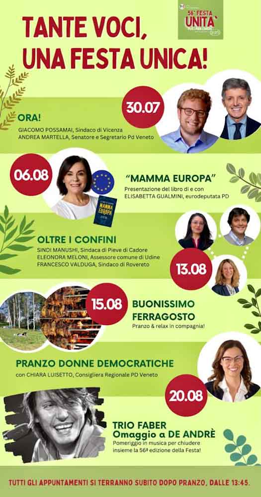 Domenica 30 luglio ad aprire la Festa ci saranno il segretario regionale del Pd, Andrea Martella e il neo sindaco di Vicenza, Giacomo Possamai in dialogo con Roger De Menech, il segretario del circolo di Ponte e Soverzene, Doriano Lavina, il segretario provinciale Alessandro Del Bianco e il sindaco di Ponte nelle Alpi, Paolo Vendramini. Appuntamento alle ore 13.45 dopo il consueto pranzo con le specialità locali.