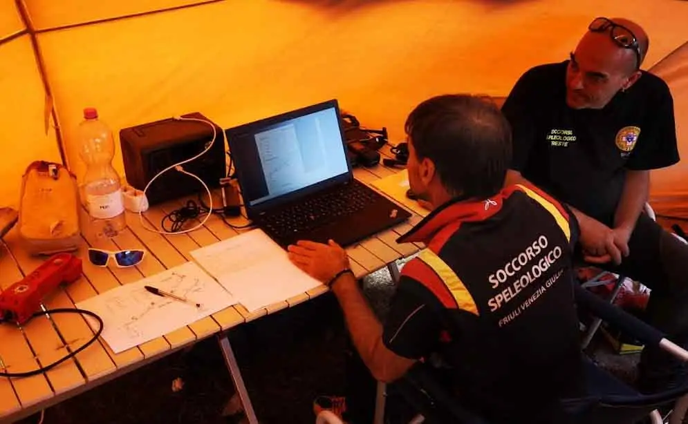 Dopodichè è entrata in grotta la prima squadra composta da 6 tecnici, elitrasportati insieme al materiale tecnico, dal campo base collocato a Malga Prati di Sotto in Val D’Ambiez fino ad ingresso grotta, ed in circa 5 ore di progressione ha raggiunto il luogo dell’incidente.