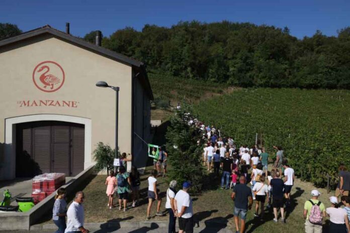 «Quest’anno – ha dichiarato il titolare della cantina Le Manzane, Ernesto Balbinot – abbiamo voluto cambiare e vendemmiare nei vigneti più impervi: i terrazzamenti che ricoprono la cantina (3 mila e 500 metri quadrati di vigna). Abbiamo raccolto circa 35 quintali di uva che saranno implementati lunedì (oggi ndr) quando i nostri ragazzi finiranno di vendemmiare per un totale di un centinaio di quintali di uva. E’ doveroso da parte mia ringraziare tutti gli sponsor, i partner, gli enti che hanno dato il patrocinio alla manifestazione e tutto lo staff della cantina Le Manzane che con il loro entusiasmo e il loro lavoro rendono possibile ogni anno questa manifestazione. Un ringraziamento particolare all’Associazione per il Patrimonio delle Colline del Prosecco di Conegliano e Valdobbiadene per il sostegno e il contributo dato al progetto.».