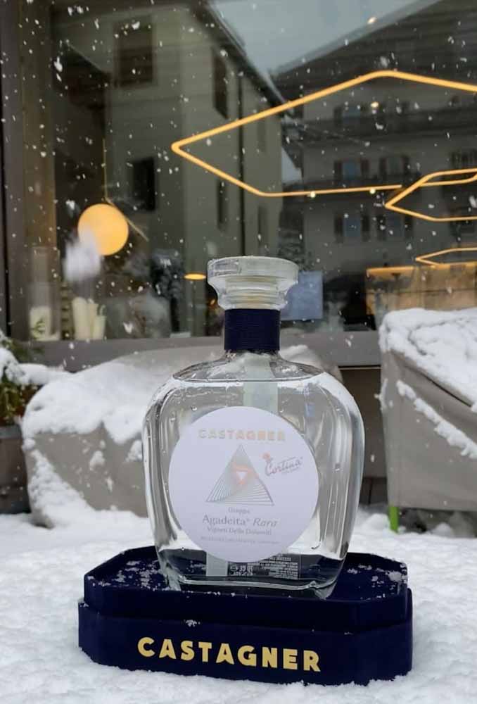 Cortina d’Ampezzo, 23 febbraio 2024_Una straordinaria nevicata ha battezzato, questa mattina allo store “L’Ambiente” di Corso Italia 147 a Cortina d’Ampezzo (Belluno), l’apertura della prima bottiglia di Agadeìta, la grappa di Cortina. Il mastro distillatore Roberto Castagner, uno dei nomi più celebri della grappa di qualità, ha voluto così rendere omaggio alla “Regina delle Dolomiti” dedicandole una sua creazione ottenuta da vinacce provenienti da uve dei vigneti della IGT Dolomiti coltivate nel Bellunese.