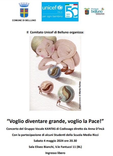 Il Comitato Provinciale Unicef di Belluno, in occasione del 50° compleanno di Unicef Italia (1974 – 2024 ) organizza sabato 4 maggio in Sala Eliseo Bianchi alle ore 20.30 un evento particolare, “Interverrà il gruppo vocale Kantas di Codissago diretto da Anna D’Incà – anticipa la presidente provinciale dell’Unicef Maria Cristina Zoleo – al quale va il nostro ringraziamento per la preziosa disponibilità, e alcuni studenti della scuola Media “S. Ricci” che, guidati dalla loro insegnante, hanno preparato poesie e riflessioni riguardanti il tema della pace, di cui il mondo e ciascuno di noi ha tanto bisogno. L’evento ha il patrocinio di Comune e Provincia di Belluno”.