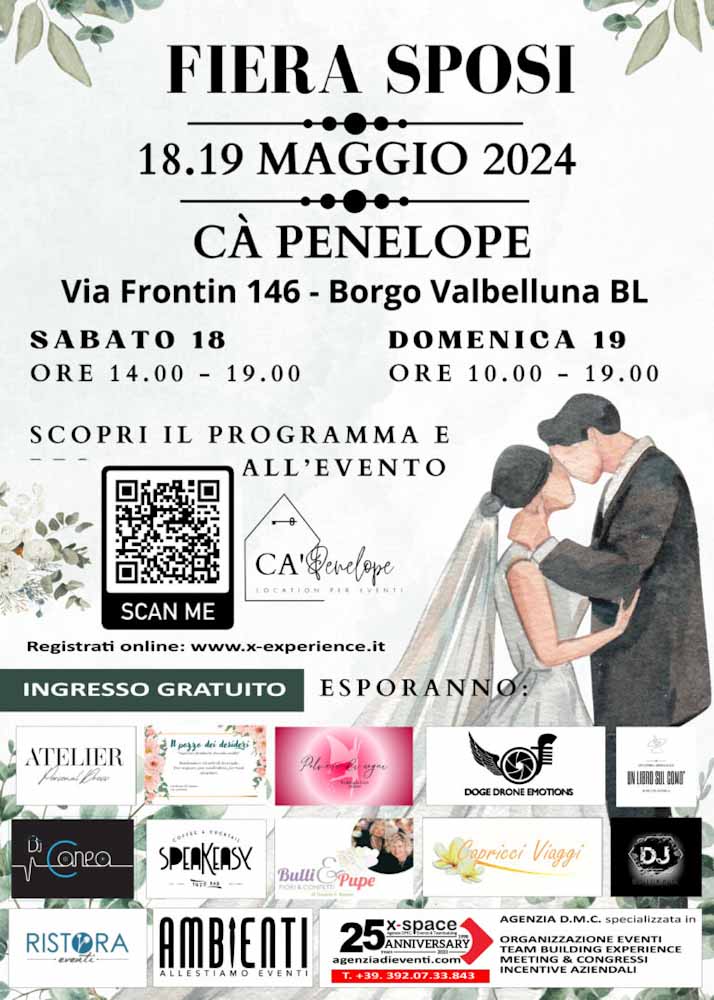 Sabato 18 e domenica 19 maggio a Cà Penelope, in via Frontin n.146 a Borgo Valbelluna, si terrà la Fiera sposi. Un evento gratuito con registrazione.