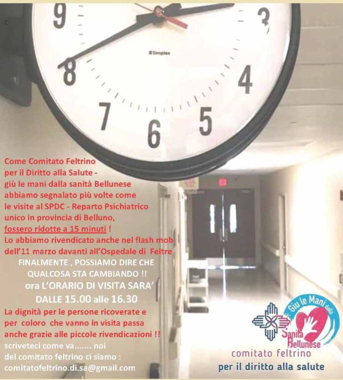 Come Comitato Feltrino per il Diritto alla Salute – giu’ le mani dalla Sanità Bellunese abbiamo segnalato più volte come le visite al SPDC – Reparto Psichiatrico unico in Provincia di Belluno fossero ridotte a 15 minuti.