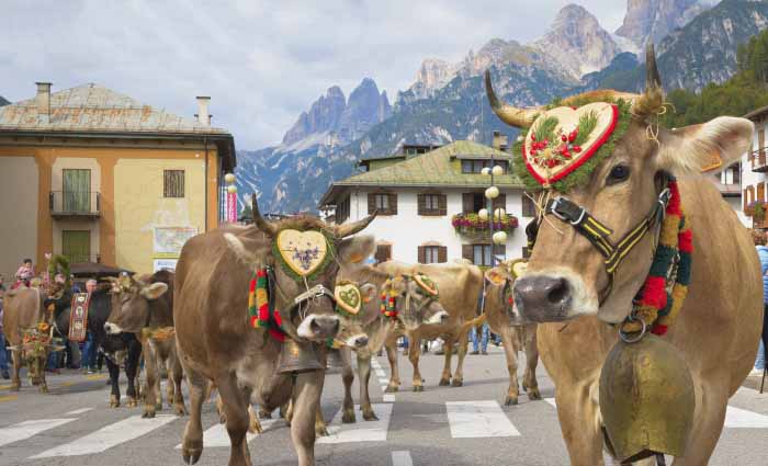 Le mucche, dopo aver trascorso l’estate nei pascoli in alta quota, libere e felici, se ne ritornano a valle per affrontare l’inverno al riparo della stalla. La discesa, che in dialetto diventa “desmonteada”, rappresenta un giorno solenne per gli allevatori che vestono a festa i propri animali con decorazioni e ornamenti speciali, fiocchi colorati e nastri, fiori e collari ricamati.