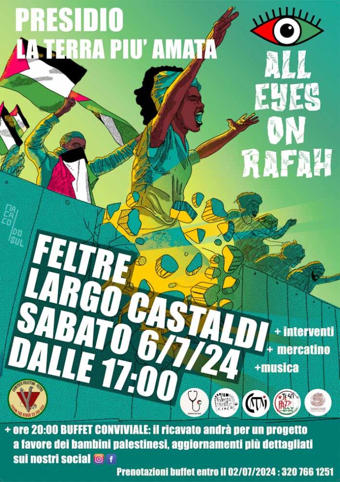 Dopo la marcia del 10 febbraio e il presidio del 13 aprile, il Comitato Palestina – Feltre promuove un altro evento in largo Castaldi: un presidio e buffet, per rinnovare il sostegno al popolo palestinese, che da ormai 9 mesi è vittima di un violentissimo attacco che ha determinato la distruzione di interi quartieri, della quasi totalità delle infrastrutture civili, degli ospedali e delle scuole e che, oramai da molto tempo, ha assunto i tratti di una vera e propria pulizia etnica.