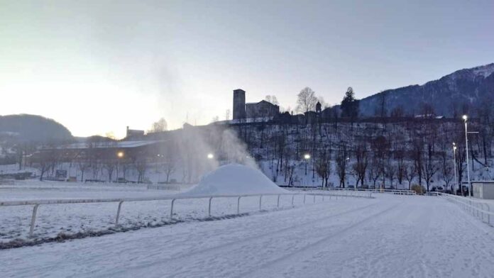 Le rigide gelate notturne dell’ultima settimana hanno permesso ai due cannoni sparaneve di lavorare a pieno regime per produrre la quantità di neve necessaria alla realizzazione del circuito. Dall’alba di questa mattina ruspa e battipista sono in azione per distribuire la neve lungo tutto il percorso. In serata il manto nevoso è stato tirato a lucido e sono stati tracciati i binari per la tecnica classica, mentre nel frattempo si è provveduto all’allestimento del container che ospiterà la zona accoglienza e il noleggio.