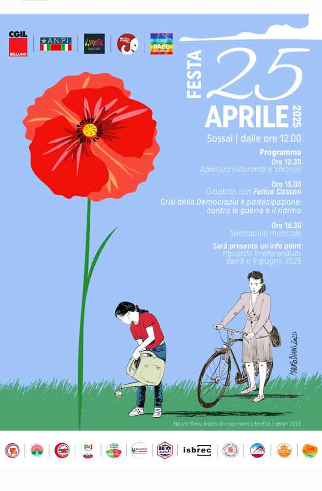 Sossai (BL) – Anche quest’anno la comunità si riunisce per celebrare la Festa del 25 Aprile, giornata simbolo della Liberazione dal nazifascismo, con un ricco programma di eventi a partire dalle ore 12.00. L’iniziativa, promossa da numerose associazioni del territorio, si propone non solo di commemorare il passato, ma anche di riflettere sul presente e sul futuro della democrazia italiana.