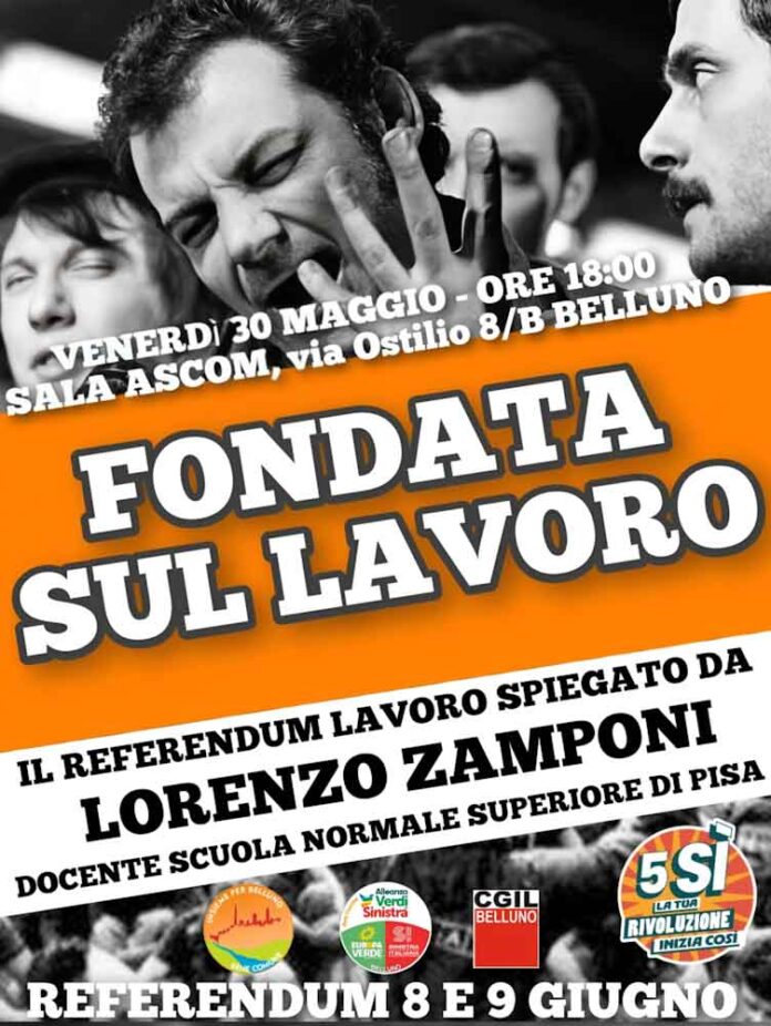 Venerdì 30 Maggio alle ore 18 nella sala “ASCOM” (Via Ostilio 8/B) a Belluno si terrà l’incontro dal titolo “Fondata sul lavoro” promosso da CGIL Belluno, Insieme per Belluno e Sinistra Italiana/AVS Belluno e rientrante nelle iniziative di informazione sui cinque