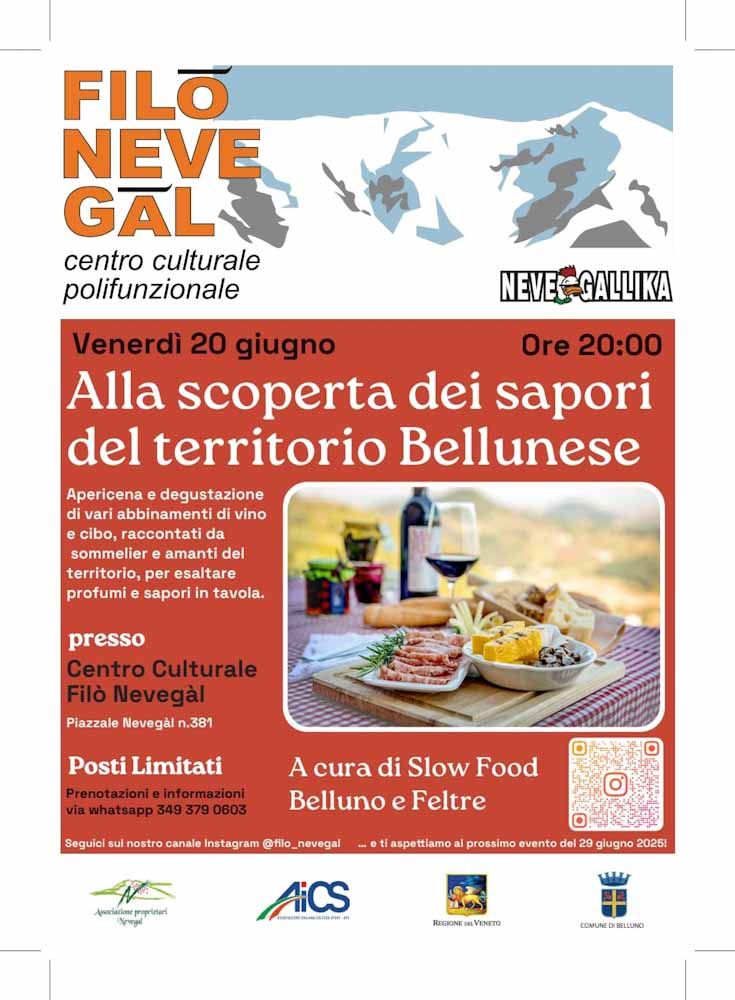 Venerdì 20 giugno alle ore 19:45, negli spazi del Filò in Nevegal (Piazzale Nevegal, 381), si terrà una cena guidata alla scoperta dei sapori del nostro territorio.