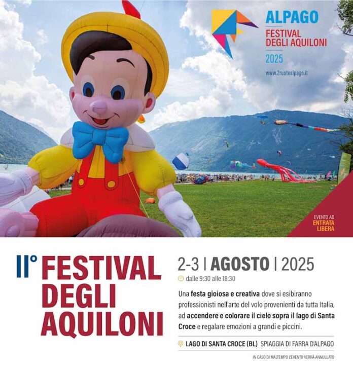 La seconda edizione del Festival degli Aquiloni si terrà in riva al lago di Santa Croce il 2 e 3 agosto 2025, a cura del Comune di Alpago alla presenza del sindaco Alberto Peterle, del comitato Alpago 2 ruote e solidarietà,rappresentato dal presidente Ennio Soccal e di Eventi Volanti rappresentati da Filippo Gallina.