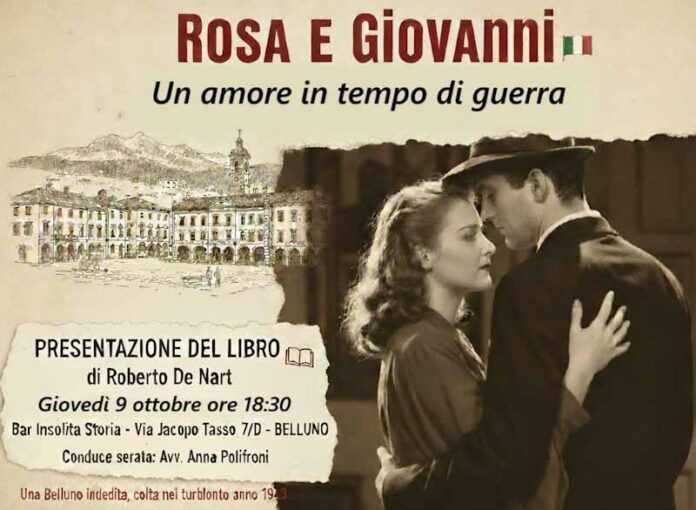 Si terrà giovedì 9 ottobre alle ore 18:30 al Bar Insolita Storia di Belluno in via Jacopo Tasso, 7/D (vicino a Piazza Piloni) la presentazione del romanzo storico “Rosa e Giovanni. Una storia d’amore in tempo di guerra” di Roberto De Nart. Conduce l’incontro l’avvocato Anna Polifroni del Foro di Belluno.
