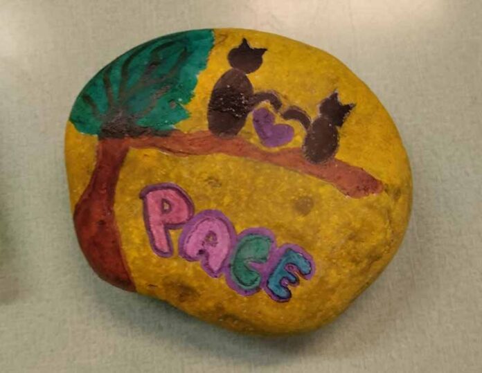 Abbiamo così pensato di realizzare prima un cartellone con tutte le parole che sono venute loro in mente riflettendo sulla pace e sulla guerra e poi abbiamo deciso di condividere, al di fuori della scuola, il loro messaggio scegliendo un modo originale: ogni studente ha raccolto un sasso che lo ispirava e, portato a scuola, lo ha dipinto proponendo un disegno che esprimesse pace».