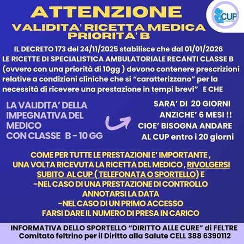 L’allarme e le istruzioni per l’uso arrivano dallo Sportello “Diritto alle Cure” di Feltre, che invita la cittadinanza alla massima attenzione per non perdere il diritto alla prestazione e dover tornare dal medico per una nuova impegnativa.