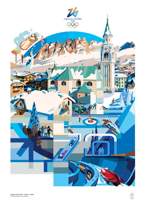 Il poster di Rovero interpreta questo passaggio di testimone attraverso un linguaggio poetico e stratificato: una composizione che unisce gli elementi dell’identità visiva contemporanea di Milano Cortina 2026 e una visione narrativa che valorizza i territori ospitanti. Il risultato è un’immagine capace di attraversare il tempo, custodendone la memoria e proiettandola verso il futuro.