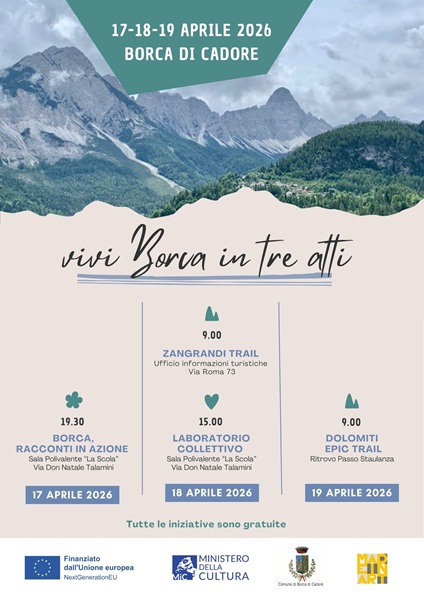 A Borca di Cadore, dal 17 al 19 aprile, inaugura un fine settimana che la cittadina dolomitica dedica a sé stessa, agli abitanti, ai visitatori. Si tratta di incontrarsi, camminare e fare insieme per guardare Borca con occhi nuovi, riscoprirla nelle poetiche di ieri e di oggi, raccontarsi e immaginare nuovi orizzonti.